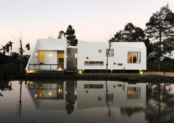 Chia làm hai khối nên ngôi nhà bên hồ nhìn từ xa không khác gì [...]